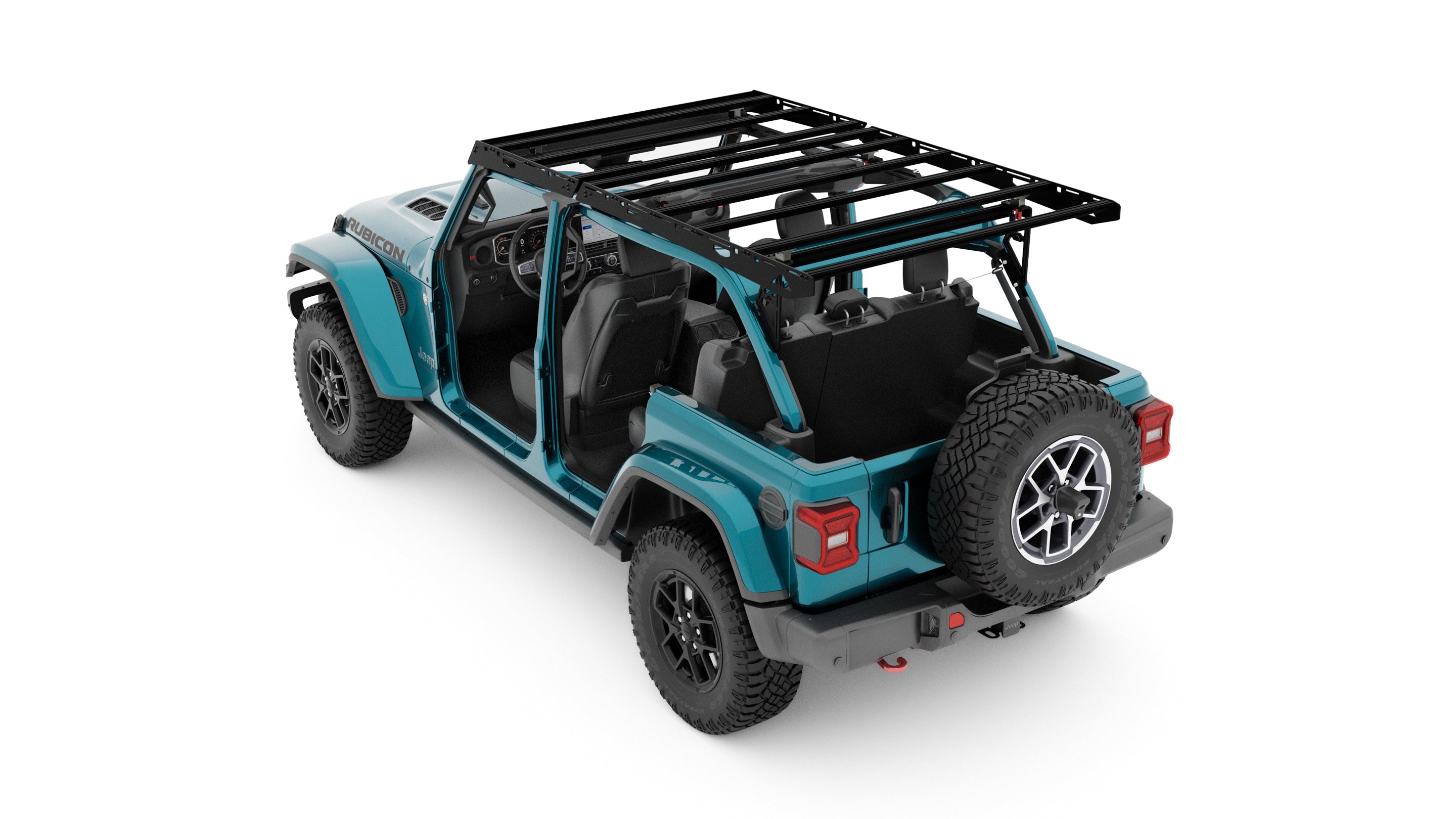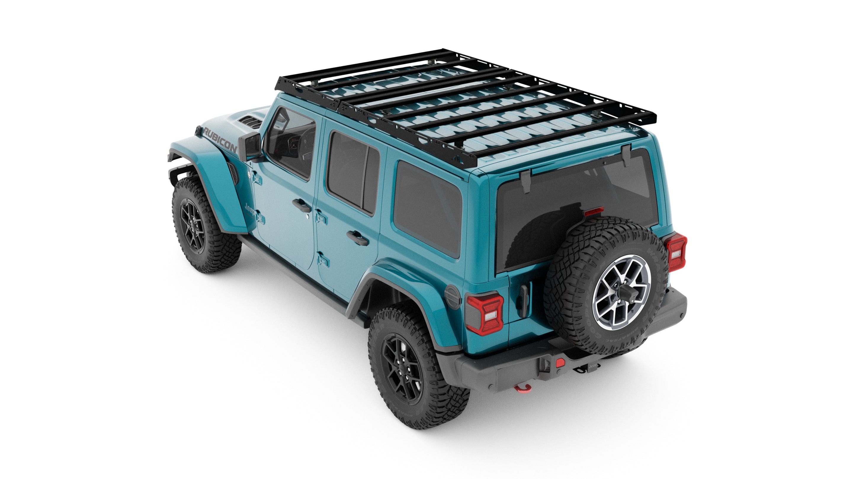 This full-length aluminum roof rack for the Jeep JLU mounts directly through the factory hard top into the roll cage, offering rock-solid strength and reliability.