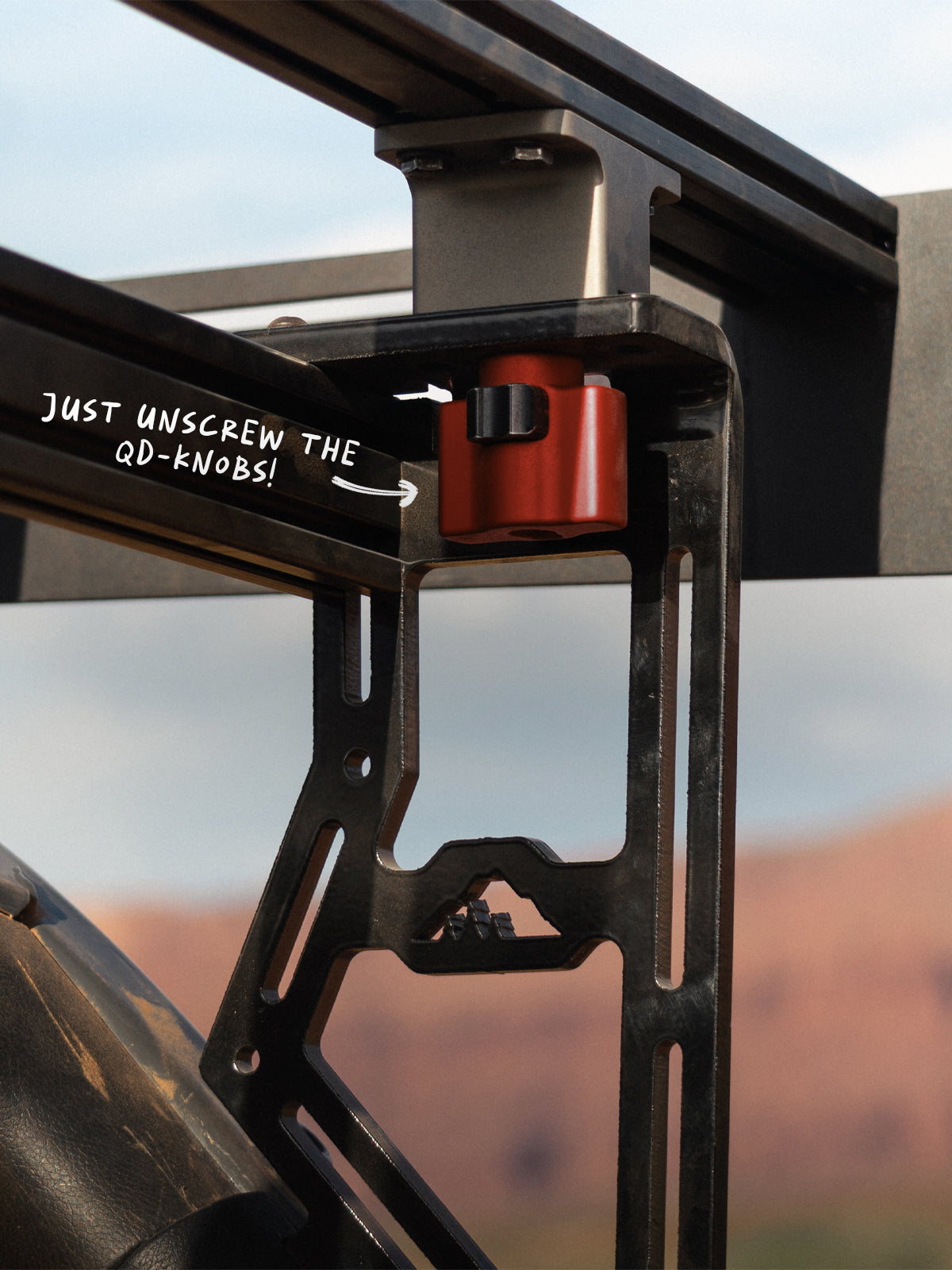 The QDHD line is built for your lifestyle, whether you’re running your Jeep with the hardtop on or off. The rack mounts directly to the roll cage. Take your factory top off for open-air cruising or keep it on when the weather isn't prime. With tool-less quick-detach hardware, switching configurations takes minutes, not hours.